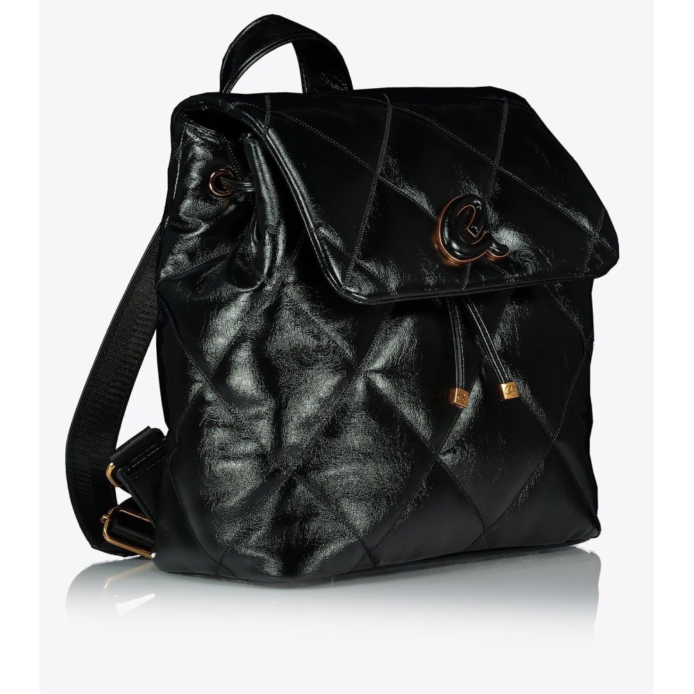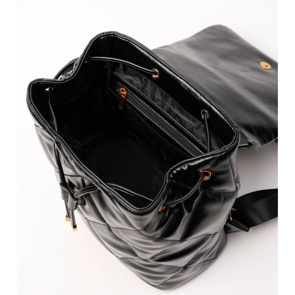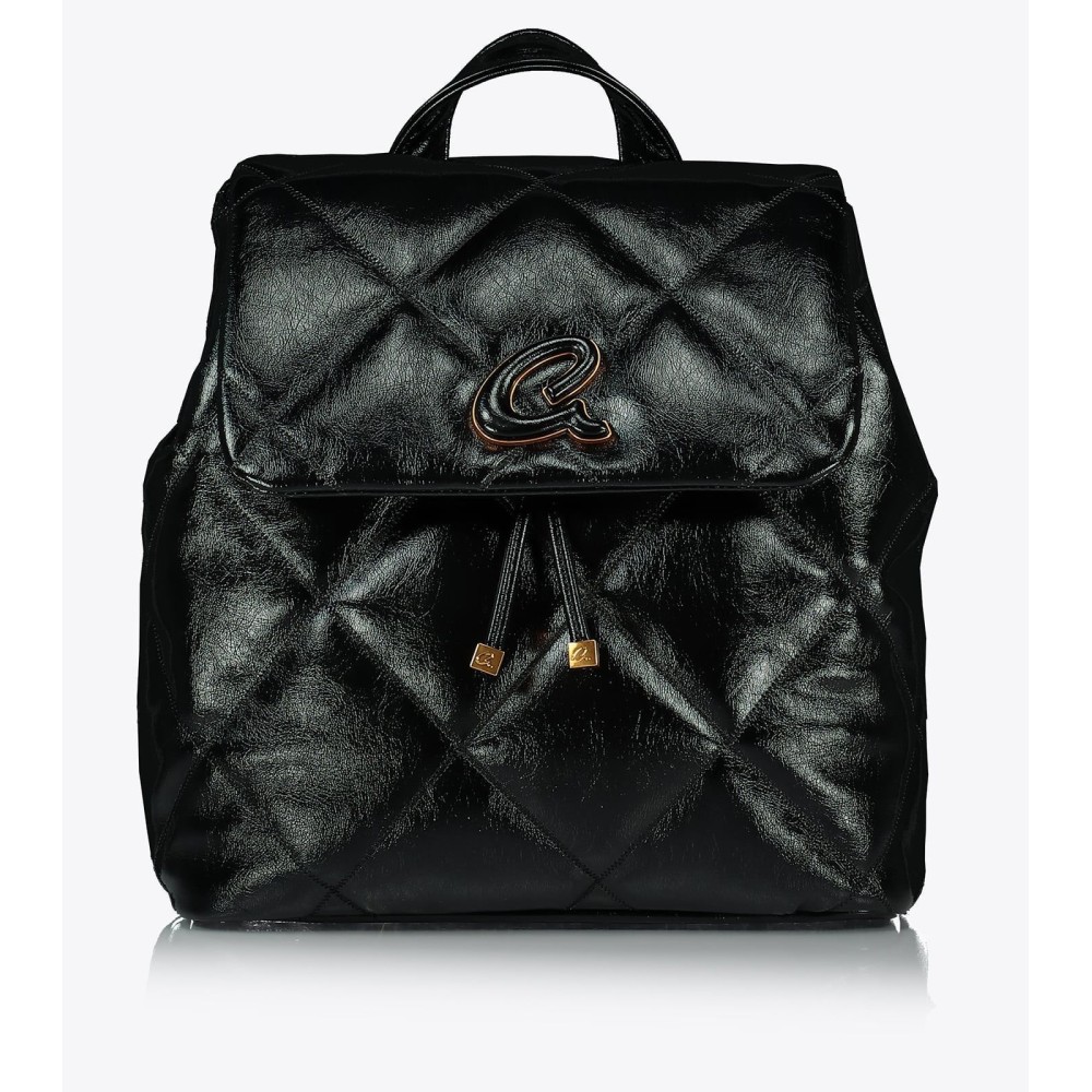 Σακίδιο πλάτης καπιτονέ από τεχνόδερμα υψηλής ποιότητας, σε μεταλλικό χρώμα. Κλείνει με κρυφό μαγνητικό κλείσιμο στο καπάκι και κορδόνι περίσφιξης σαν πουγκί. Διαθέτει ρυθμιζόμενα λουράκια πλάτης και μεταλλικό λογότυπο 'a'. Εσωτερικά είναι επενδυμένο με τυπωμένη φόδρα, θήκες με φερμουάρ και τσέπες.