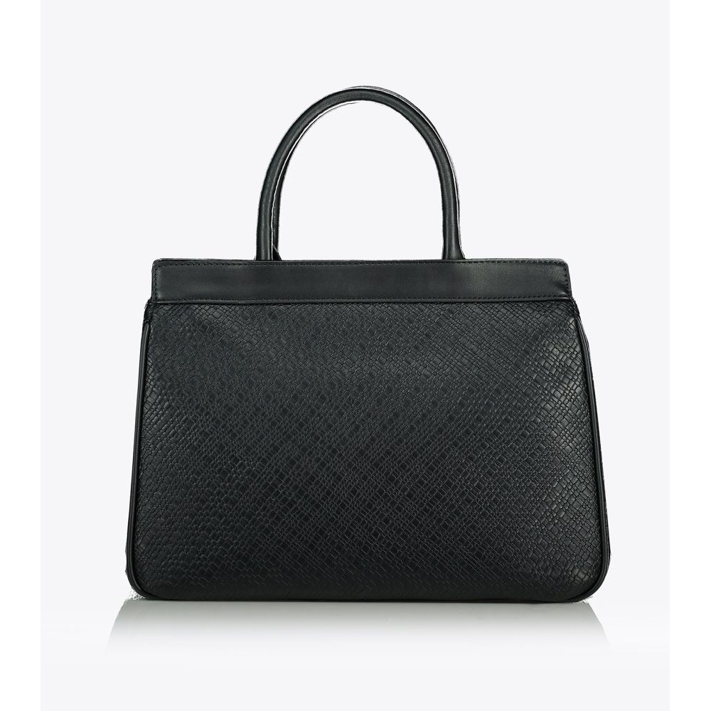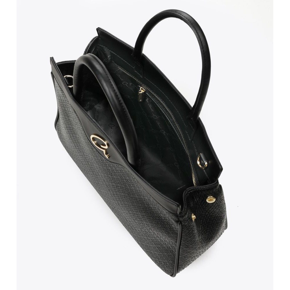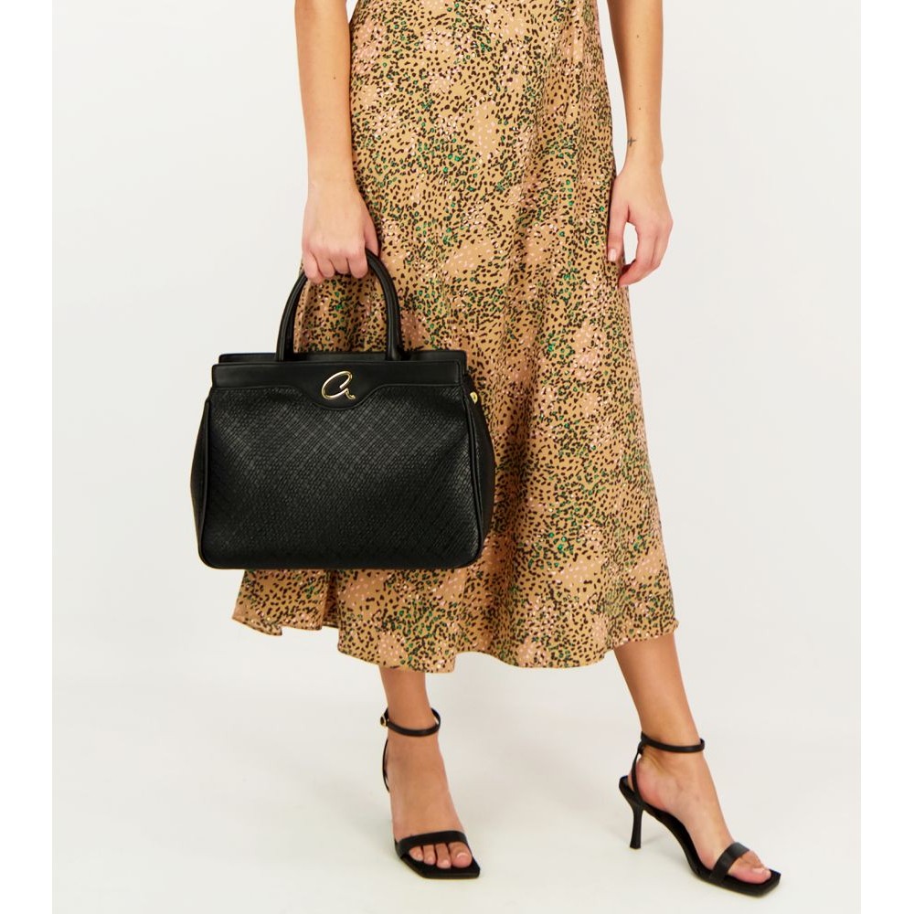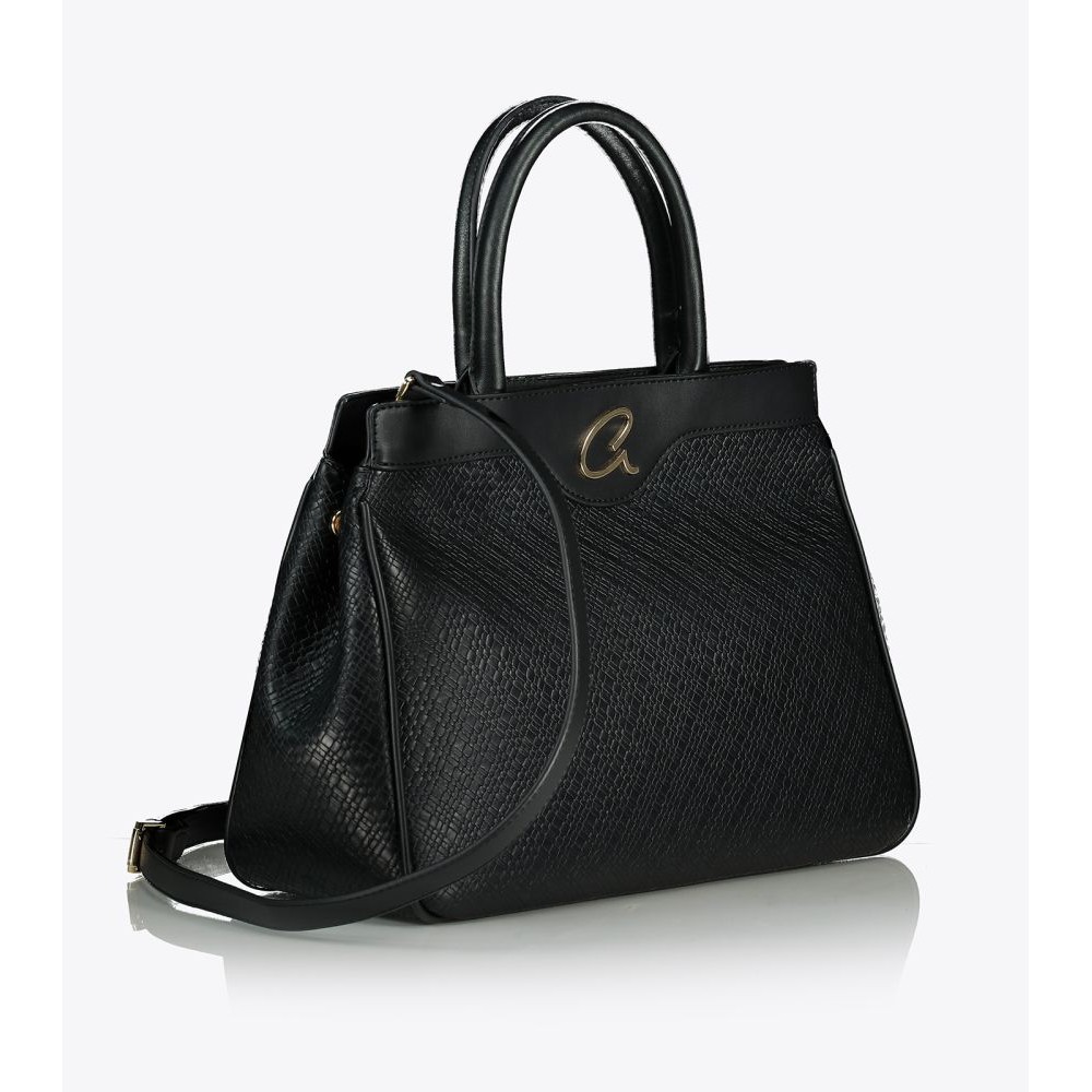 Γυναικεία τσάντα χειρός από τεχνόδερμα υψηλής ποιότητας που δίνει την αίσθηση της ψάθας. Διαθέτει διπλά χερούλια, αποσπώμενο λουράκι ώμου και κλείνει με φερμουάρ. Στα πλαϊνά υπάρχουν τρούκς. Εσωτερικά είναι επενδυμένη με φόδρα, υπάρχουν θήκες και τσέπη με φερμουάρ. Μεταλλικό logo 'a' μπροστά.