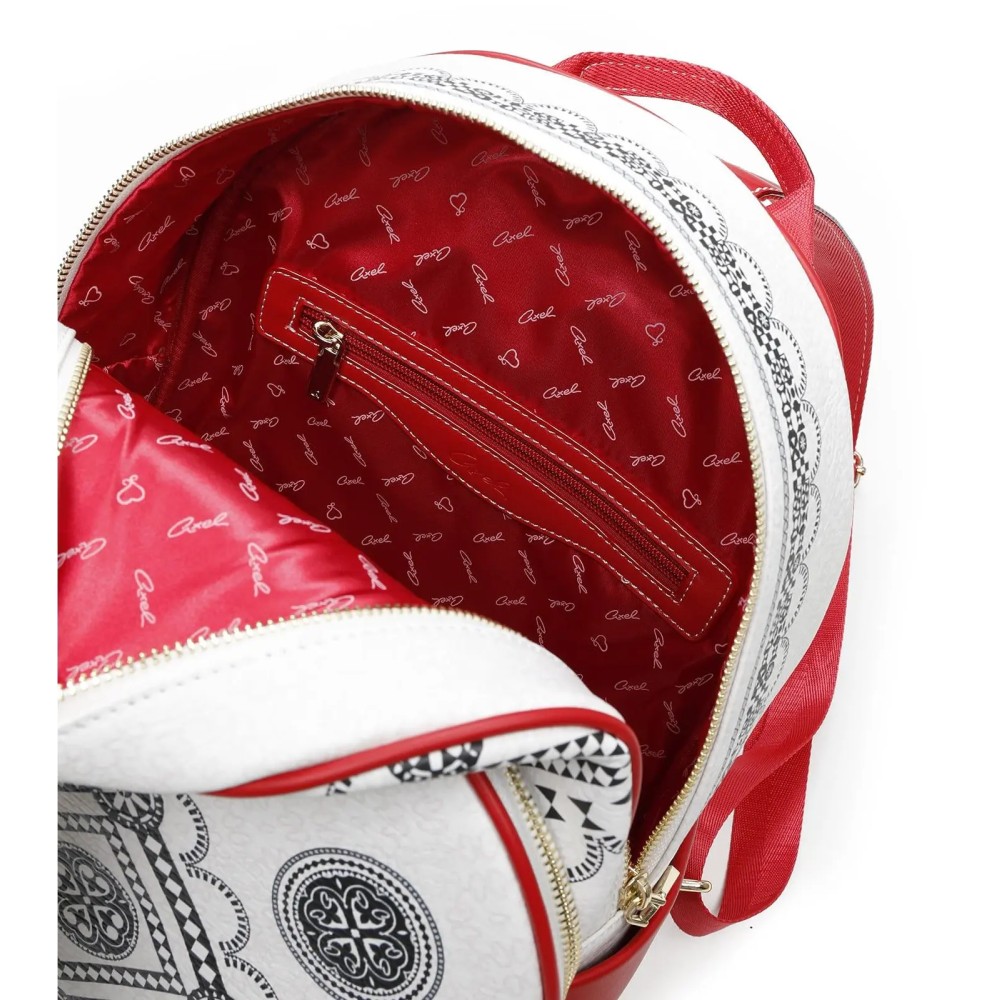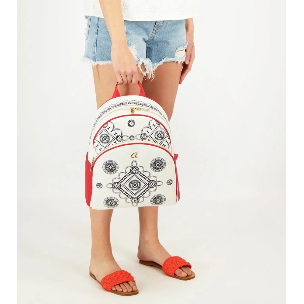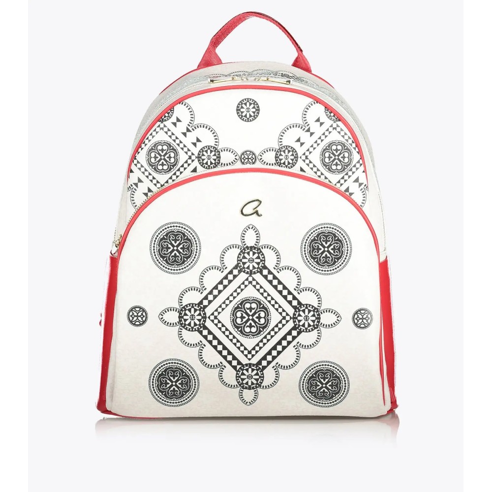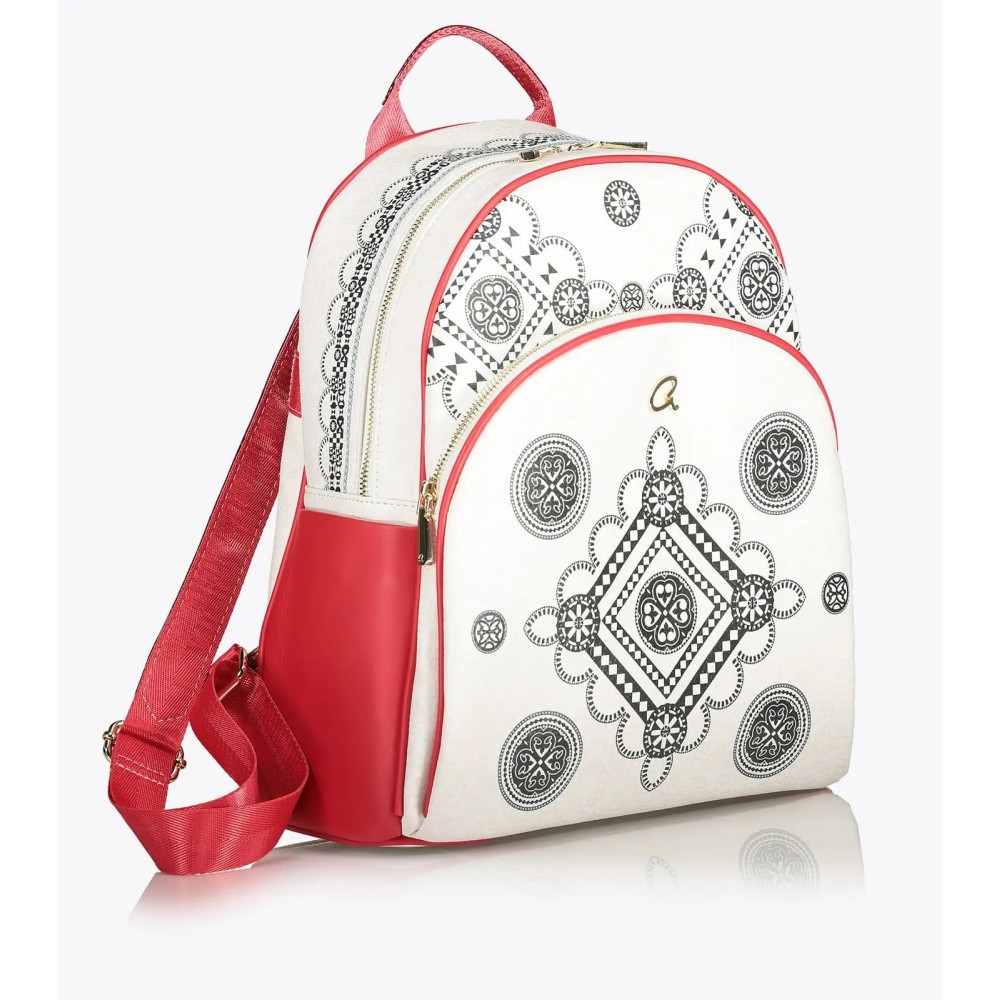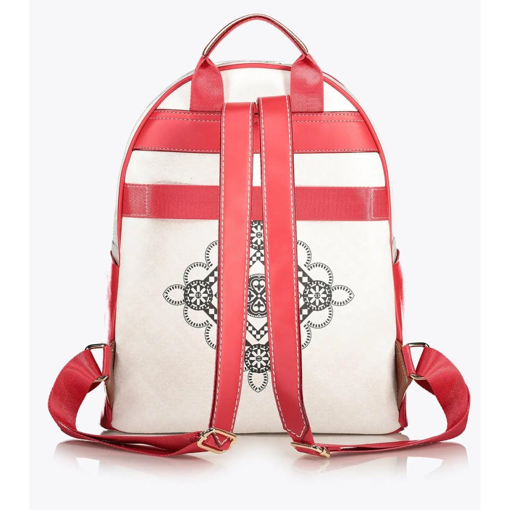 Σακίδιο πλάτης από λευκό τεχνόδερμα με κόκκινες λεπτομέρειες και μοτίβο εμπνευσμένο από το Πυργί της Χίου και της τεχνικής 'ξυστά'. Τα ξυστά είναι γεωμετρικά σχήματα που κοσμούν τις προσόψεις κτιρίων. Διαθέτει εξωτερική τσέπη με φερμουάρ, πλαϊνές θήκες, φόδρα εσωτερικά, τσέπη με φερμουάρ και θήκες.