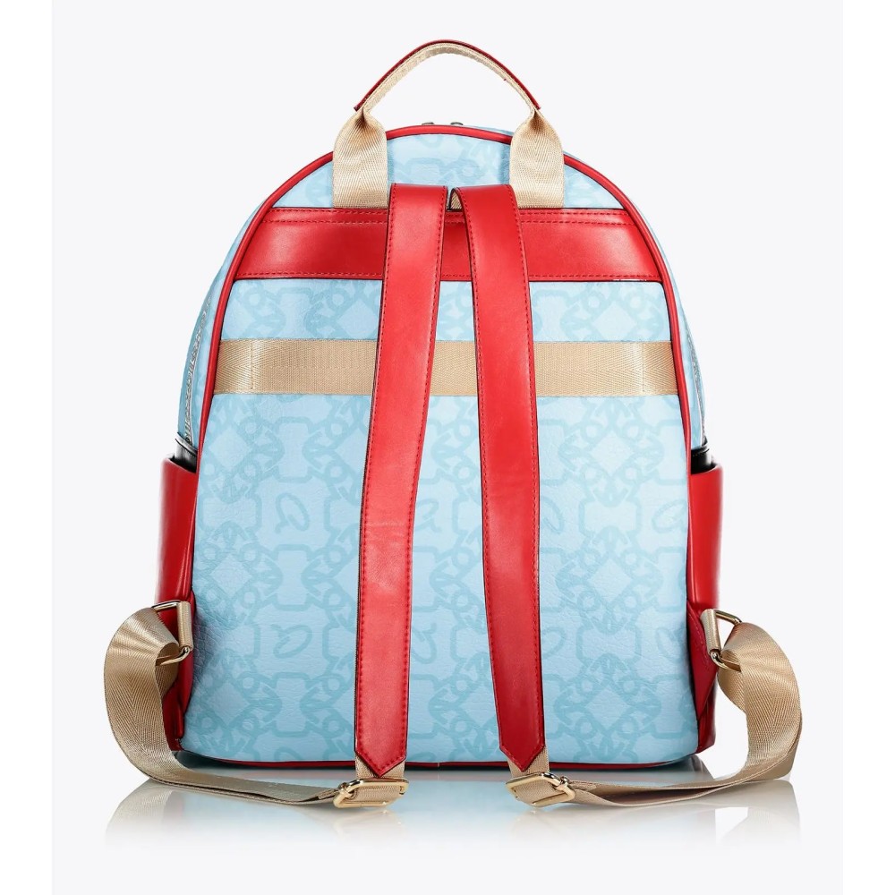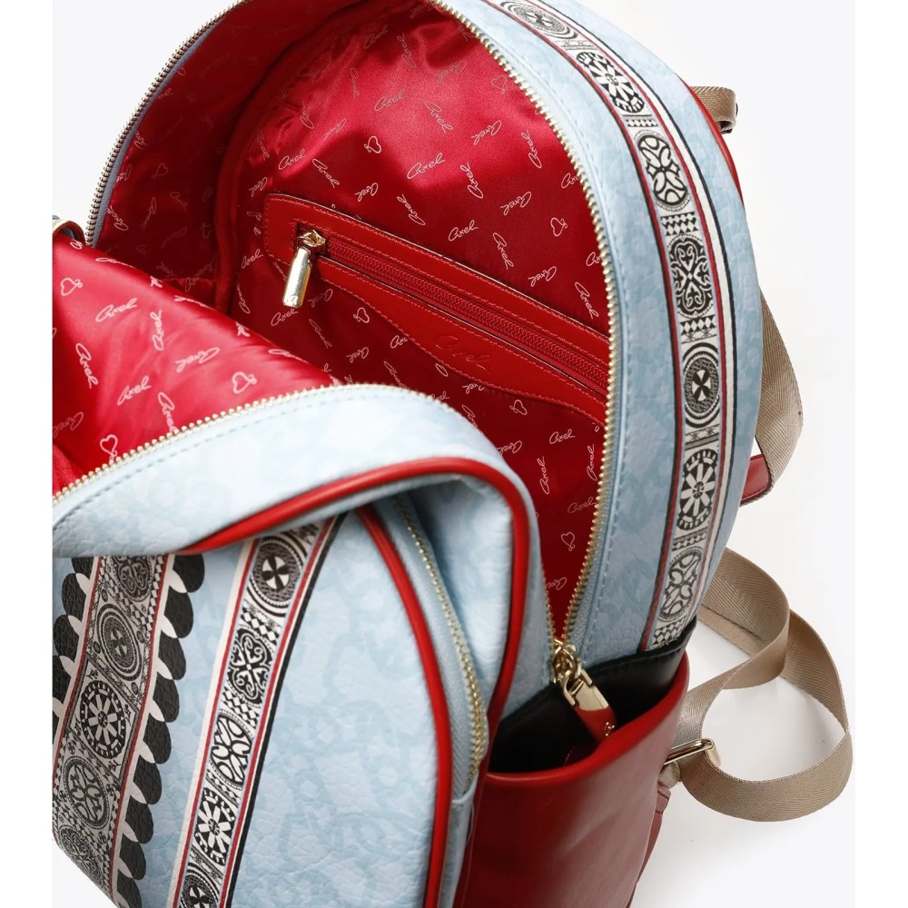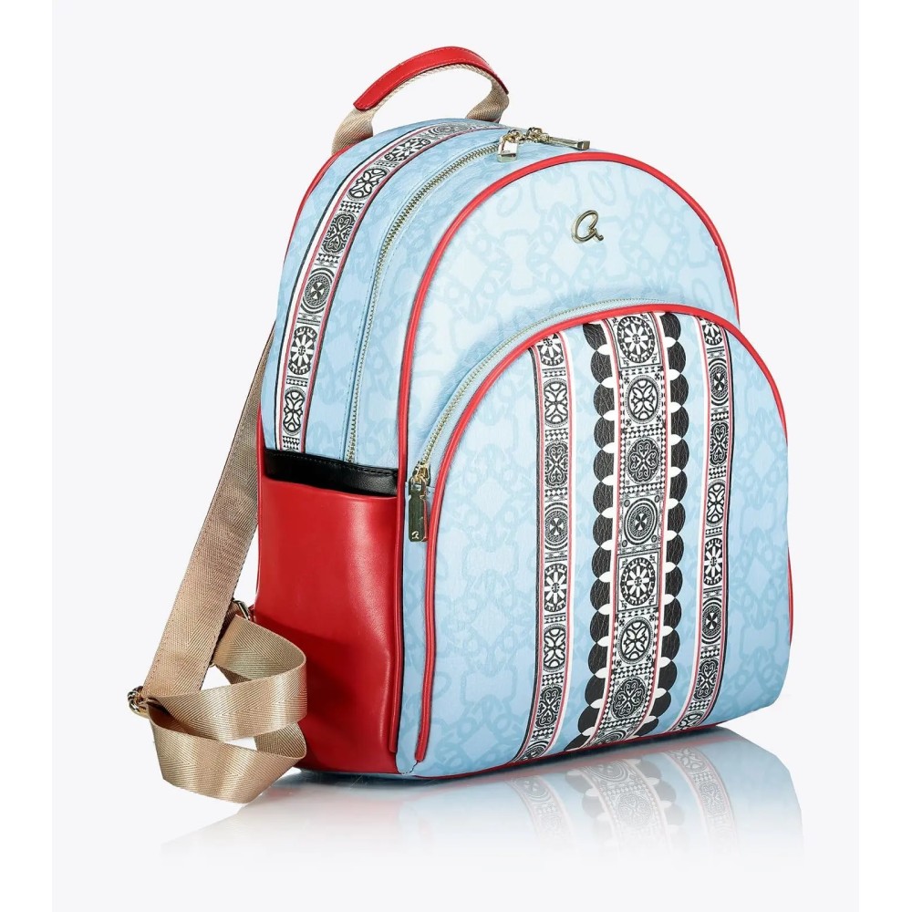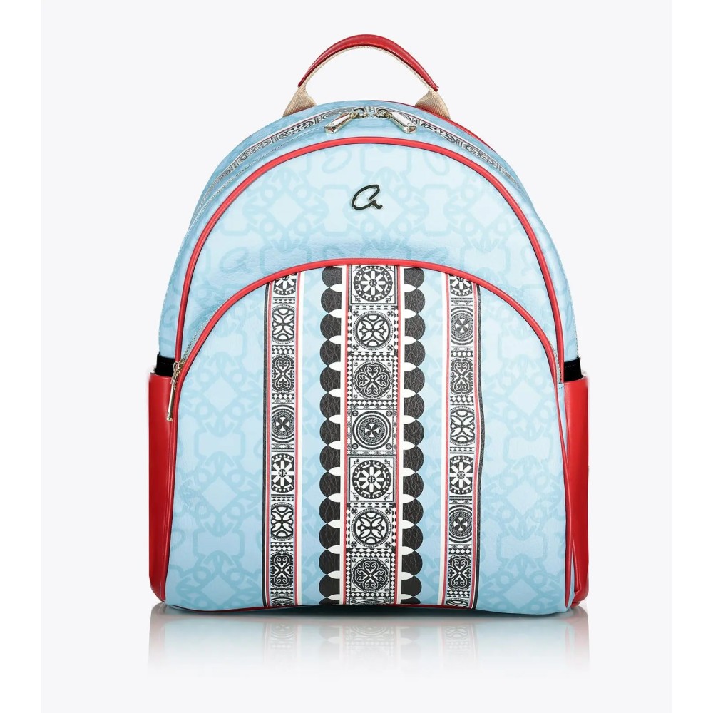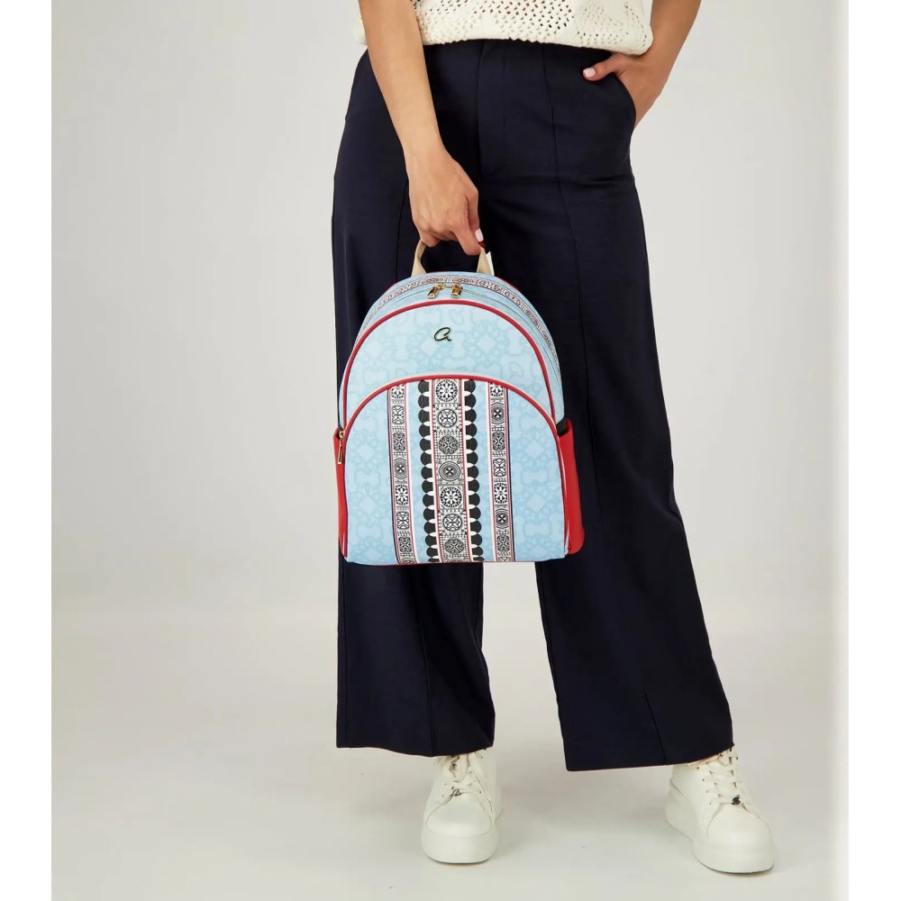 Γυναικείο σακίδιο πλάτης με μοτίβο εμπνευσμένο από το χωριό Πυργί της Χίου και της αρχιτεκτονικής τεχνικής 'ξυστά'. Τα ξυστά είναι γεωμετρικά σχήματα που κοσμούν τις προσόψεις κατοικιών και κτιρίων. Με στρογγυλή τσέπη μπροστά και πλαϊνές θήκες. Εσωτερικά υπάρχει φόδρα, τσέπη με φερμουάρ και θήκες.