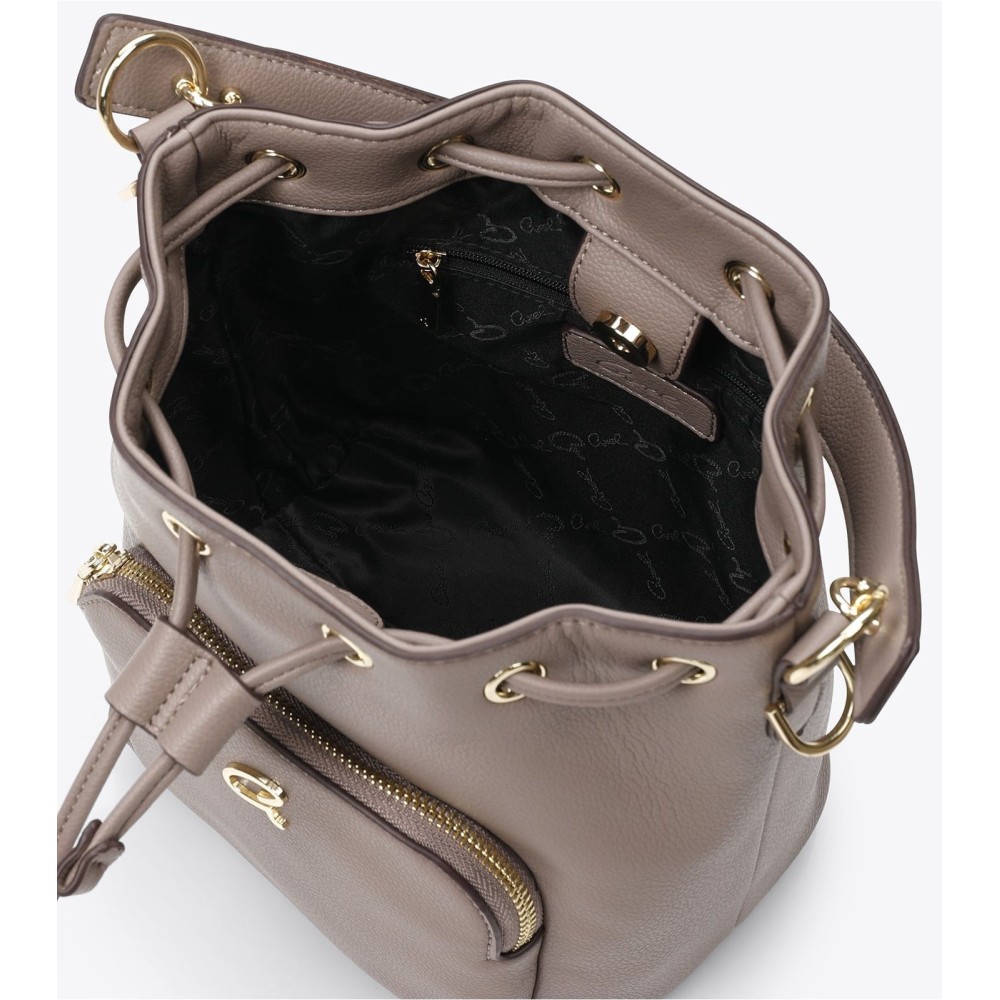 Τσάντα χειρός σε στιλ πουγκί από τεχνόδερμα. Κλείνει με κρυφό μαγνητικό κλείσιμο στο καπάκι και κορδόνι περίσφιξης. Διαθέτει ρυθμιζόμενο και αποσπώμενο λουράκι λούρεξ. Eξωτερική θήκη με φερμουάρ στο μπροστά μέρος. Eπενδυμένη με τυπωμένη φόδρα, θήκες με φερμουάρ και τσέπες.