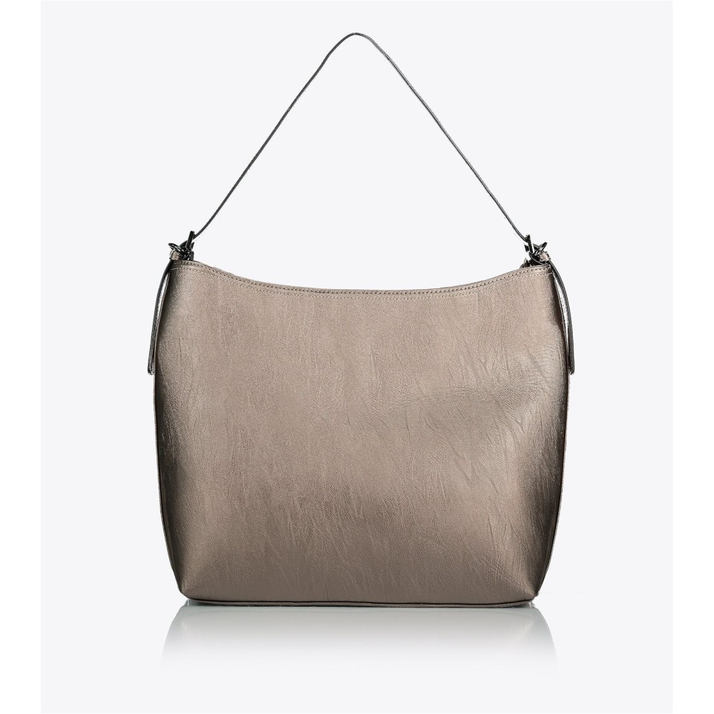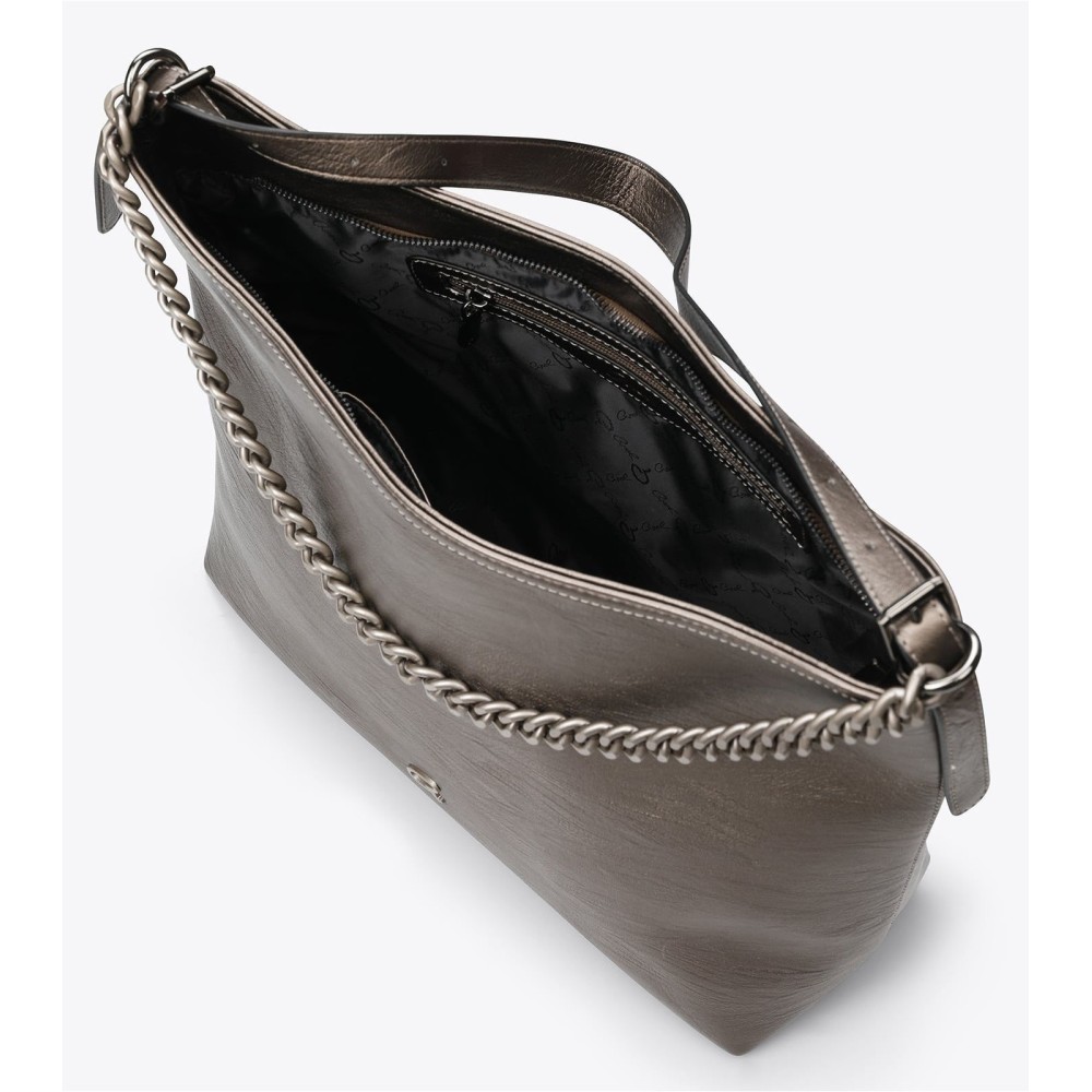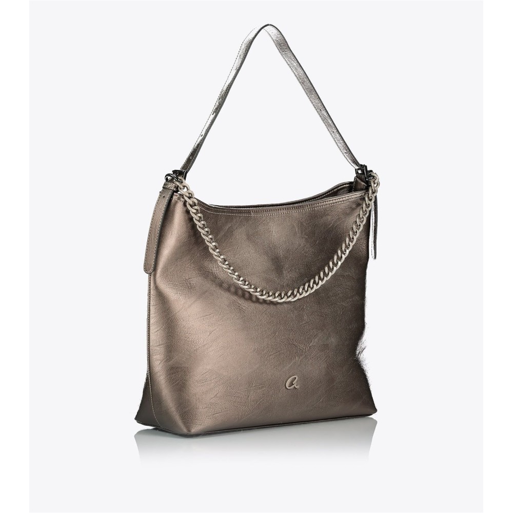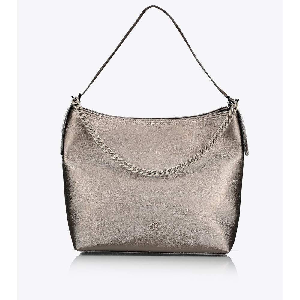 Γυναικεία τσάντα ώμου από εξαιρετικής ποιότητας τεχνόδερμα. Κλείνει με φερμουάρ, διαθέτει ρυθμιζόμενο λουράκι και κρεμαστή αλυσίδα στο μπροστά μέρος. Εσωτερικά είναι επενδυμένη με τυπωμένη φόδρα, τσέπη με φερμουάρ και θήκες. Μεταλλικό λογότυπο 'a' μπροστά