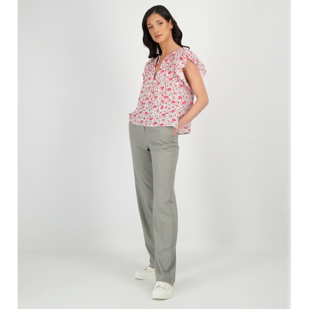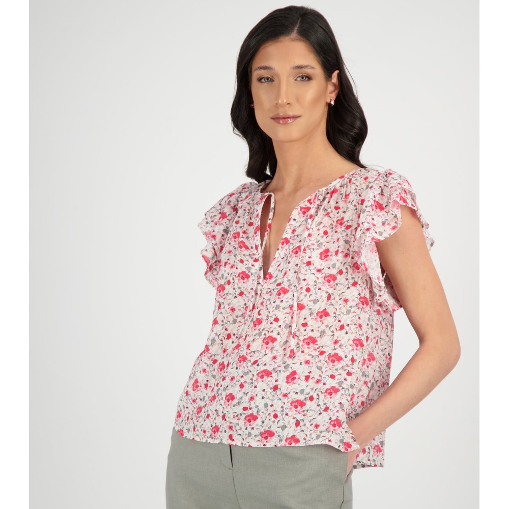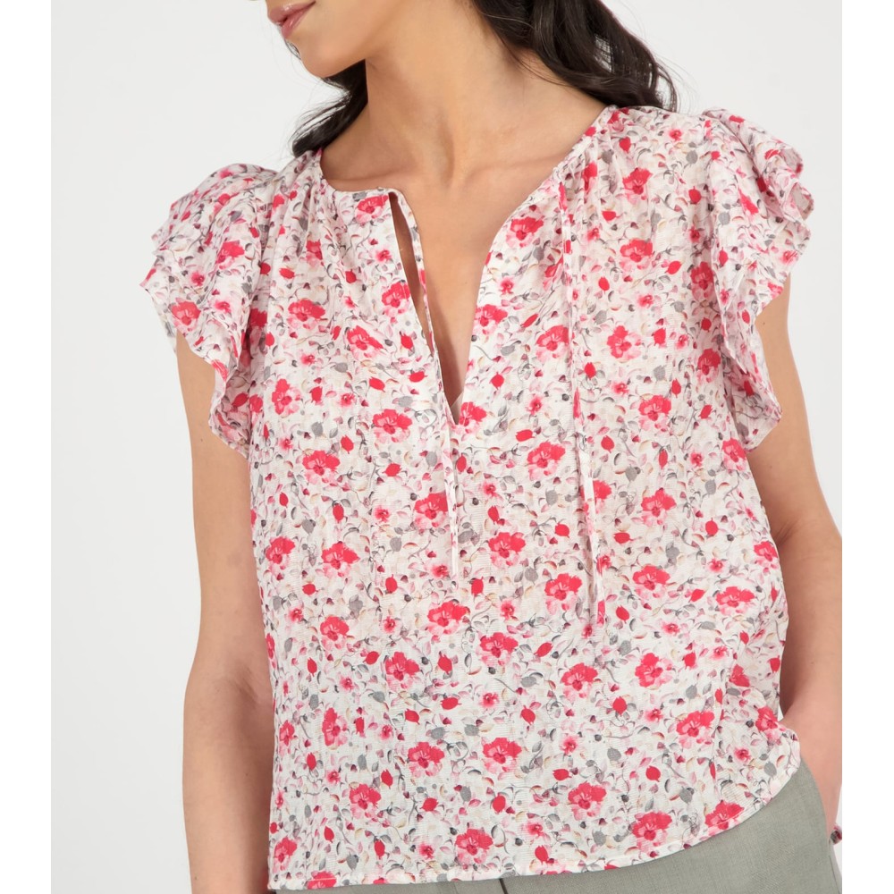 Γυναικείο φλοράλ τοπ με διπλό βολάν στα μανίκια και άνοιγμα στο ντεκολτέ. Κατασκευασμένο σε ζακάρ σιφόν ύφασμα. Το σιφόν είναι ένα αέρινο, ελαφρύ, λεπτό ύφασμα ενώ ο όρος ζακάρ δείχνει τον τρόπο που είναι πλεγμένο το μοτίβο στην ύφανση.Xαρακτηριστικά:Χρώμα Ροζ ,Σχέδιο Φλοράλ ,Μανίκια Κοντό Μανίκι ,Λεπτομέρειες  Βολάν, Εφαρμογή ρούχου Κανονική γραμμή ,Ύφασμα σιφόν ,Σύνθεση υφάσματός 72% Rayon 28% Nylon.