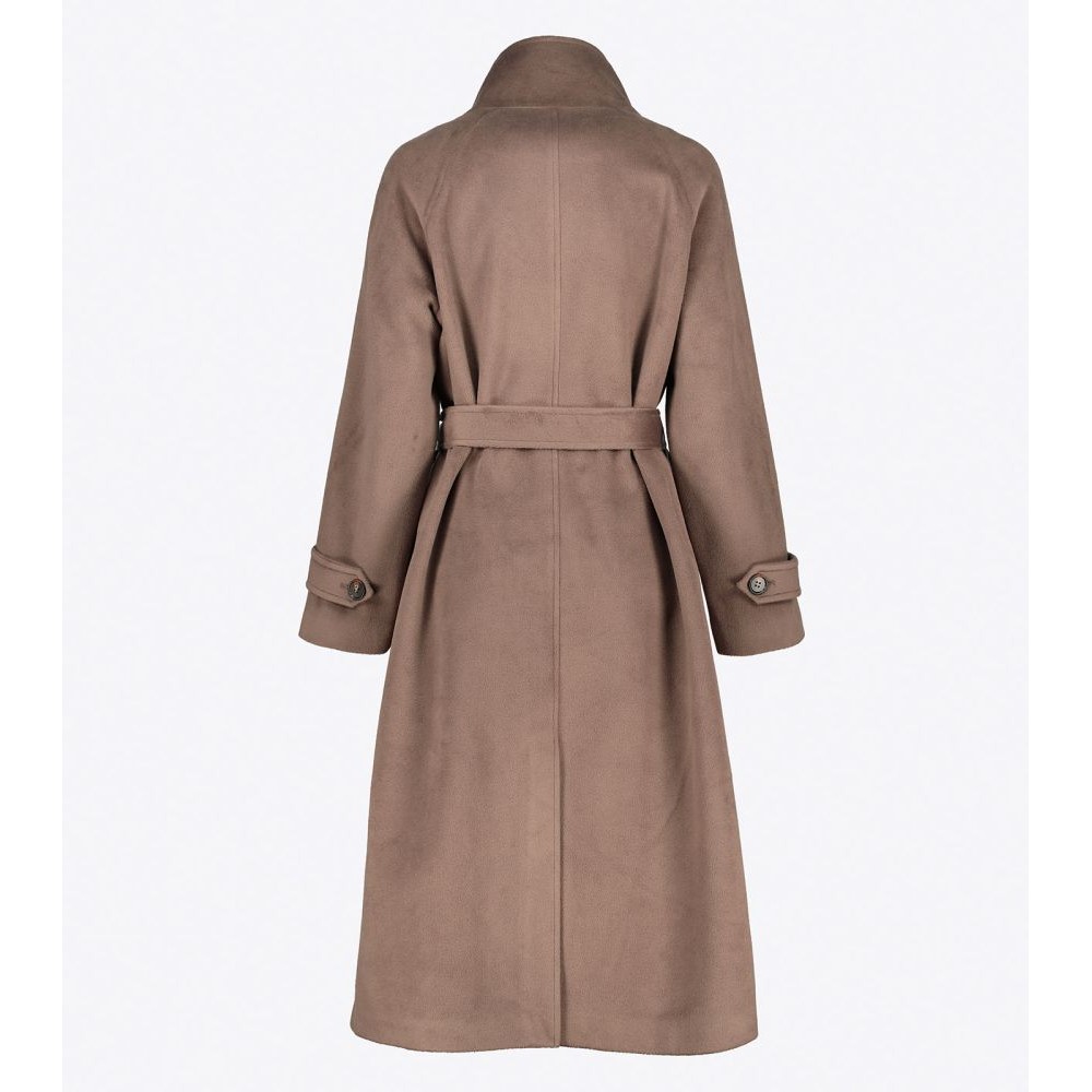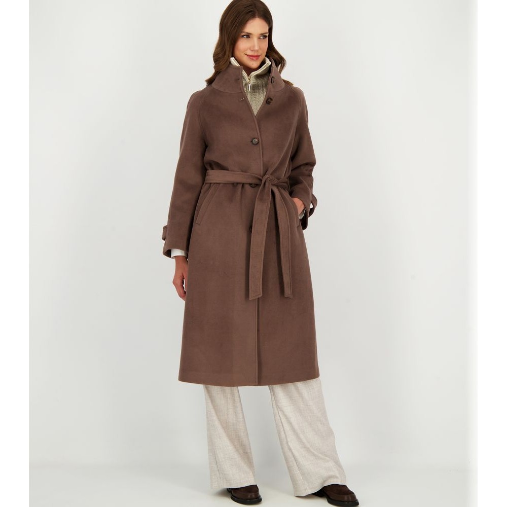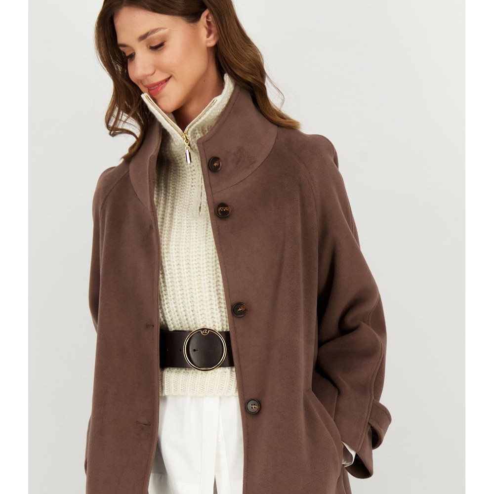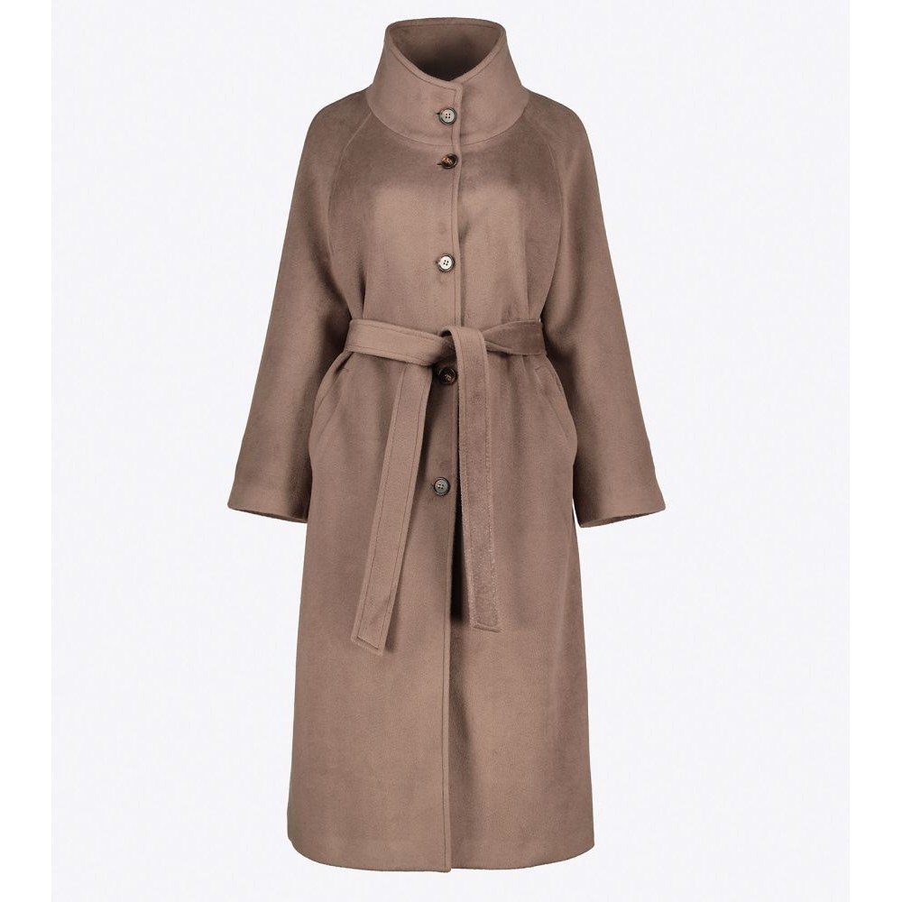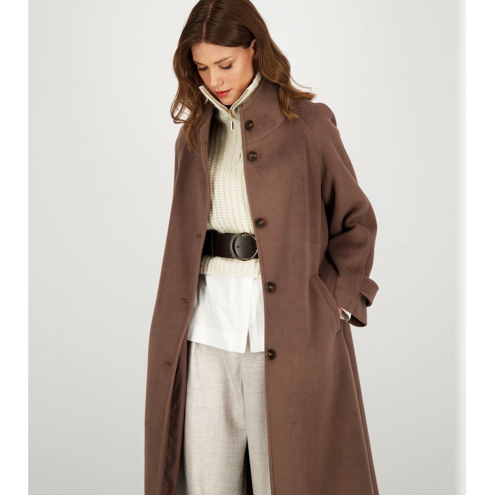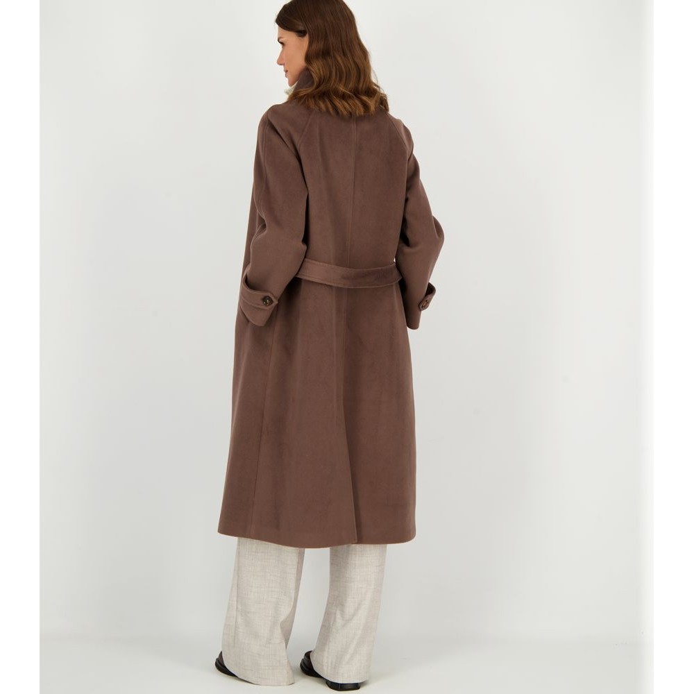 Γυναικείο παλτό με μονό κούμπωμα με πέντε κουμπιά, όρθιο γιακά, ρεγκλάν μανίκια, αφαιρούμενη ζώνη που δένει στη μέση και ρυθμιζόμενο πατ με κουμπί στη μανσέτα. Σκίσιμο πίσω.