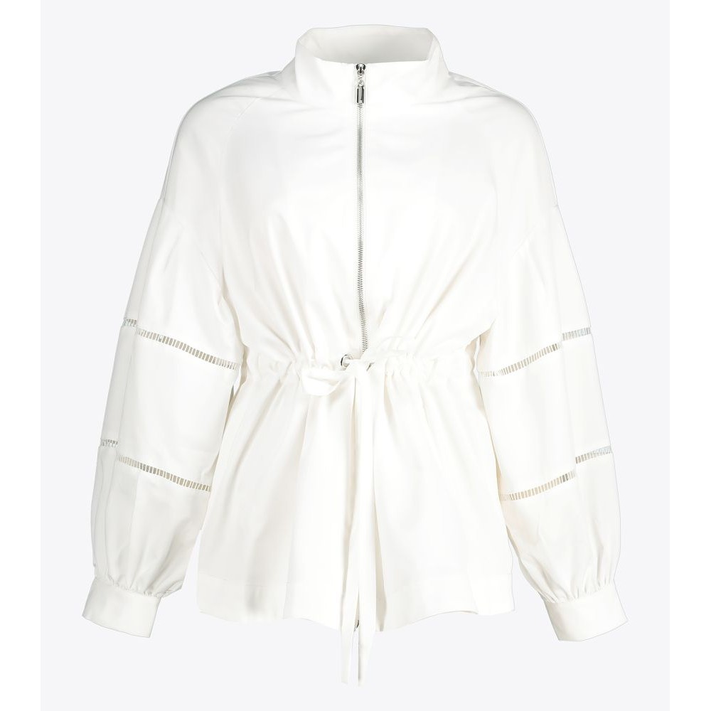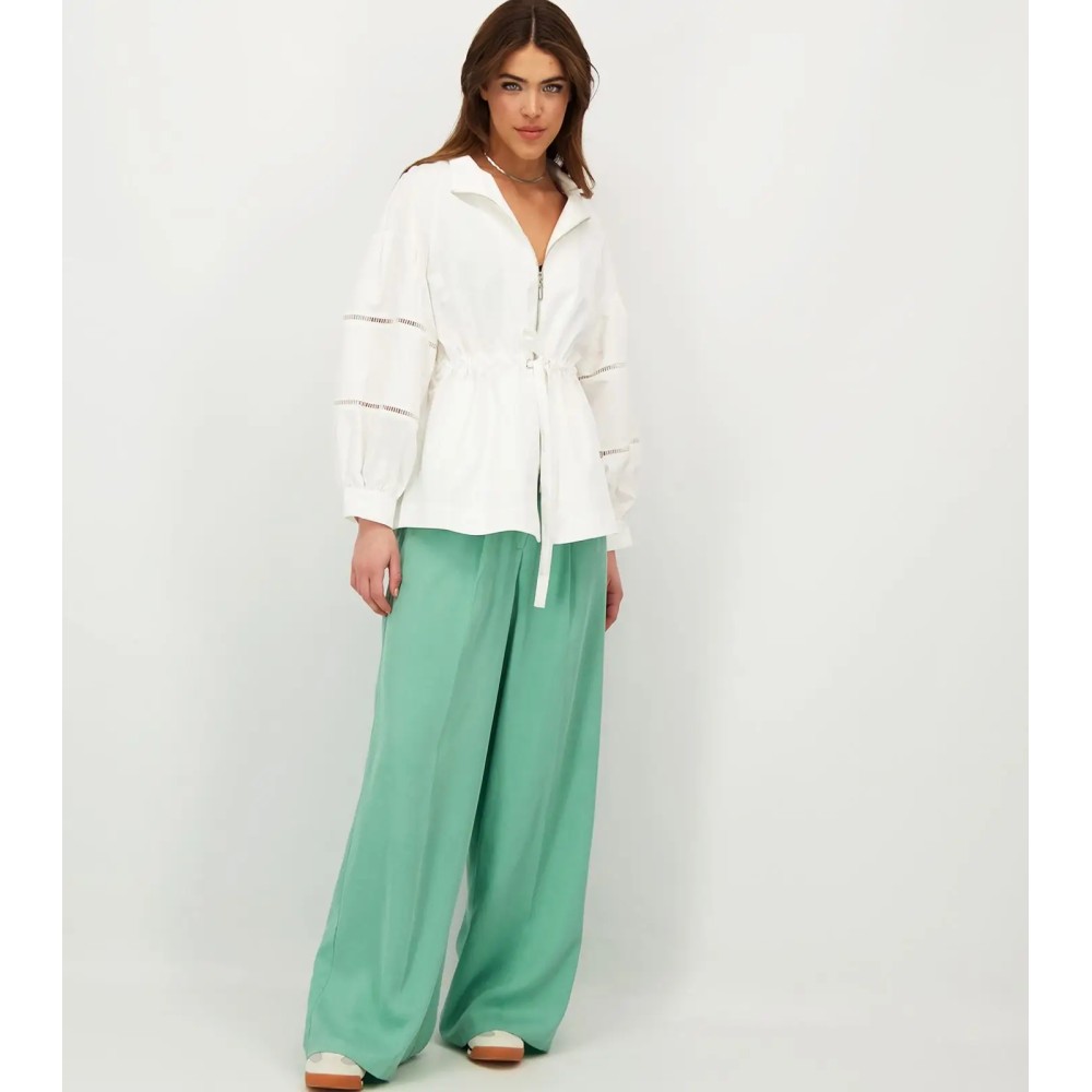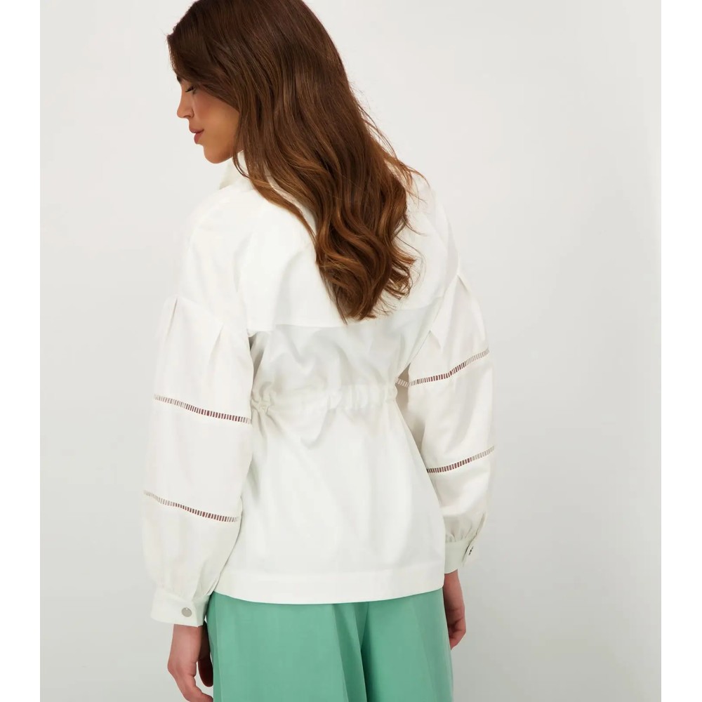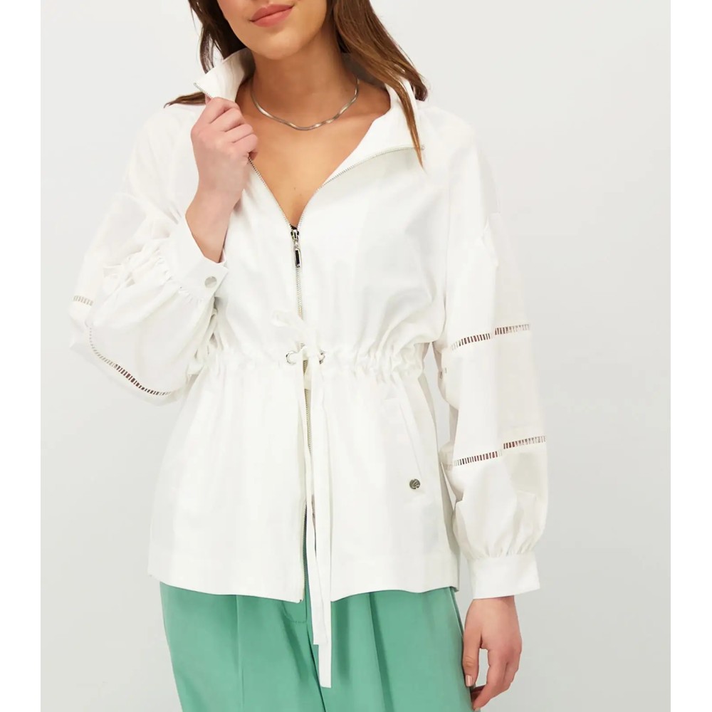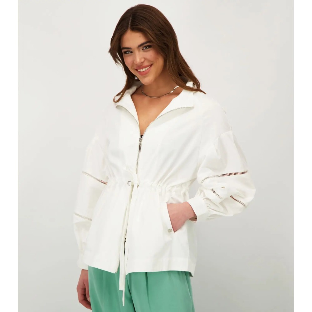 Γυναικείο ελαφρύ πανωφόρι με φερμουάρ, όρθιο γιακά, φουσκωτά μακριά μανίκια και κορδόνι στη μέση. Τσέπες μπροστά, λεπτομέρεια με κέντημα στα μανίκια και πεσμένοι ώμου. Σύγχρονου σχεδιασμού με ελαφρώς χαλαρή εφαρμογή, αποτελεί το κατάλληλο πανωφόρι για κάθε Άνοιξη και Φθινόπωρο.