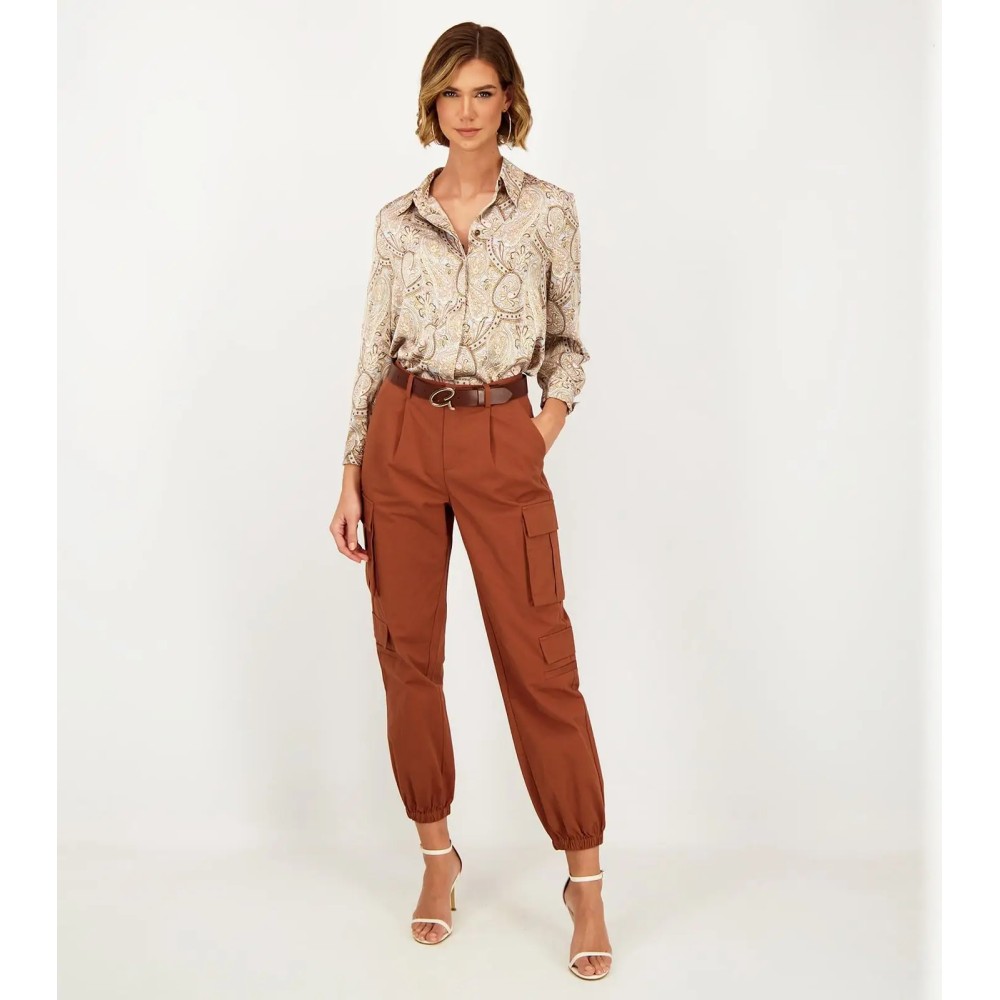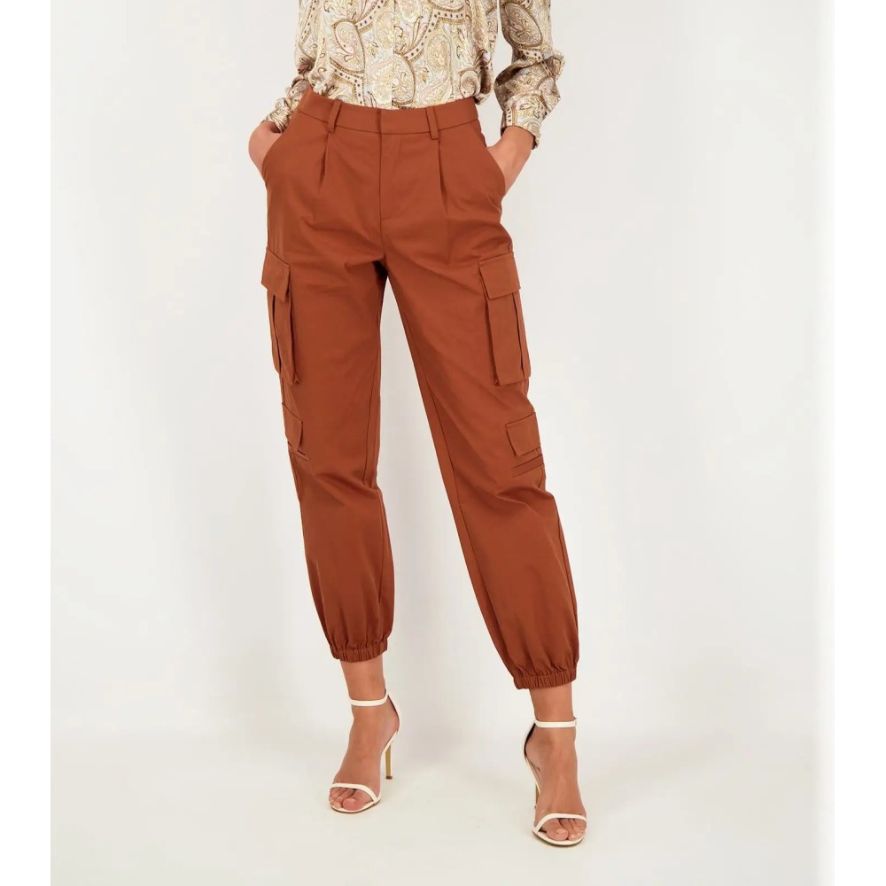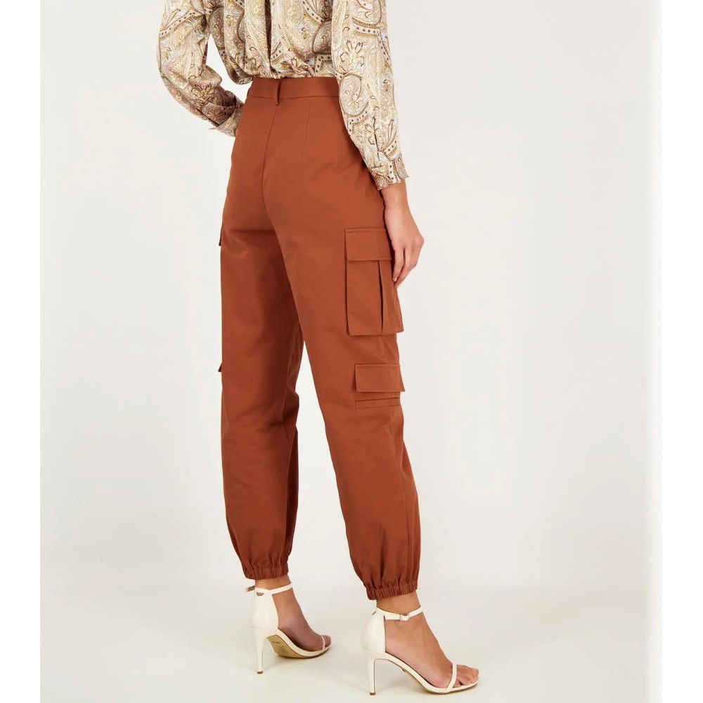 Cargo παντελόνι από βαμβακερό ύφασμα καμπαρντίνα με ψηλή μέση, κρυφό φερμουάρ και κόπιτσα στο πάνω μέρος. Λοξές τσέπες μπροστά και τσέπες με καπάκι. Γραμμή στα πόδια που στενεύει προς τα κάτω με κρυφό λάστιχο στα μπατζάκια.